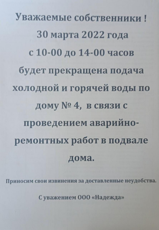 Отключение ХВС и ГВС 30.03.2022 г. по ул. Белорусская, дом 4