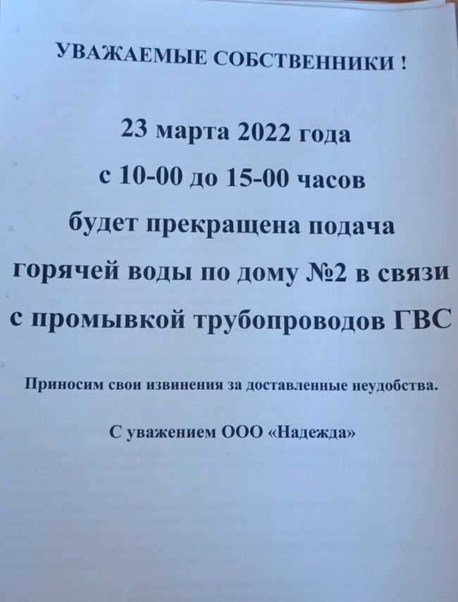 Отключение ХВС и ГВС 23.03.2022 г. по ул. Белорусская, дом 2