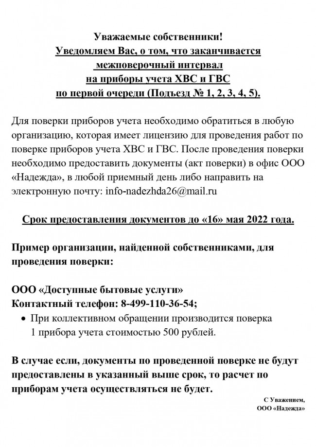 Для поверки приборов учета необходимо обратиться в любую организацию, которая имеет лицензию для проведения работ по поверке приборов учета ХВС и ГВС. После проведения поверки необходимо предоставить документы (акт поверки) в офис ООО «Надежда», в любой приемный день либо направить на электронную почту: info-nadezhda26@mail.ru