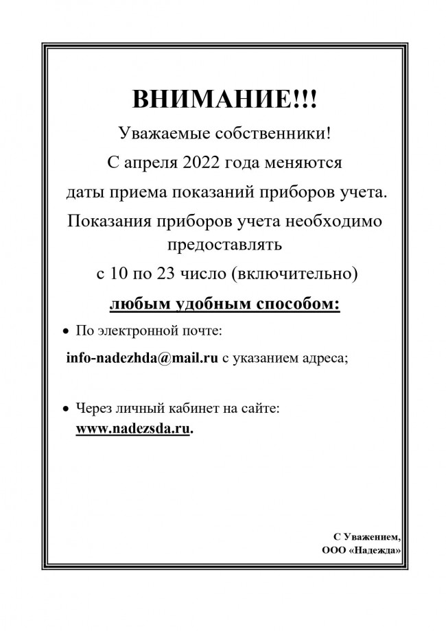 ВНИМАНИЕ!!! Меняются даты приема показаний приборов учета с 10 по 23 число