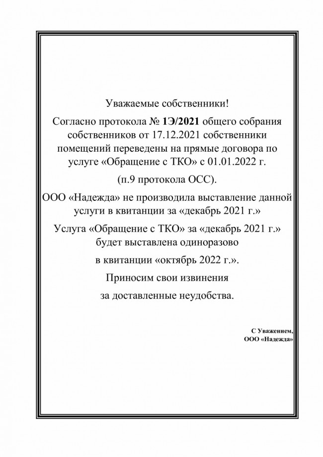 Информация для собственников МКД № 4 по начислениям за октябрь 2022 г. по услуге "Обращение с ТКО"