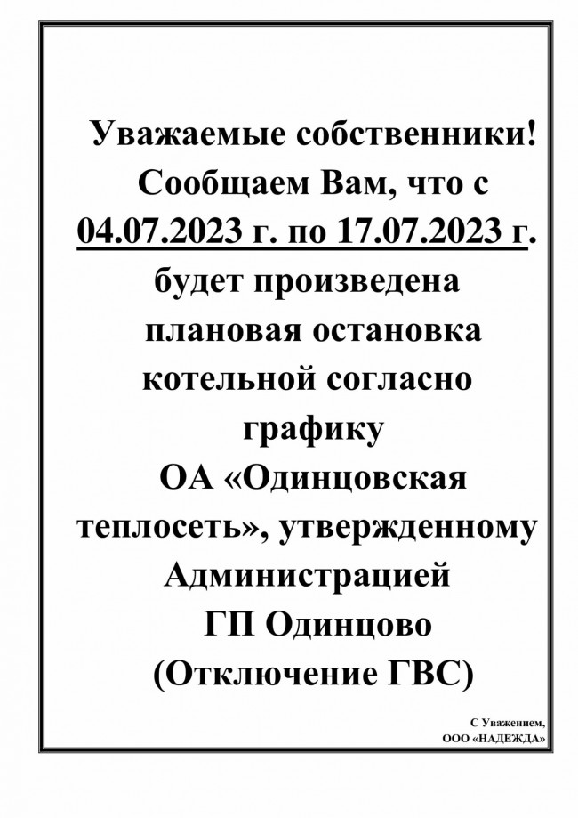 Плановое отключение горячего водоснабжения по ул. Маковского